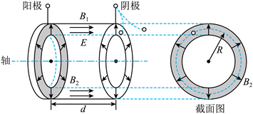 22. 我国“天宫”空间站采用霍尔推进器控制姿态和修正轨道。图为某种霍尔推进器的放电室(两个半径接近的同轴圆筒间的区域)的示意图。放电室的左、右两端分别为阳极和阴极,间距为d。阴极发射电子,一部分电子进入放电室,另一部分未进入。稳定运行时,可视为放电室内有方向沿轴向向右的匀强电场和匀强磁场,电场强度和磁感应强度大小分别为E和
