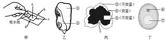 (3)图丙:用银边天竺葵(叶片边缘呈黄白色)进行“绿叶在光下制造有机物”的实验,叶片脱色后滴加碘液,实验现象如图所示,③不变蓝的原因是此处叶肉细胞中没有______(填结构名称)。