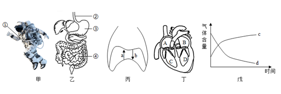 23. 2024年5月28日,神舟十八号乘组圆满完成约8.5小时的出舱活动。宇航员的生命活动需要各个器官、系统的协调配合。图甲是宇航员的资料照片,乙~丁为人体部分结构示意图,戊为两种气体含量变化曲线图。结合图示回答问题。