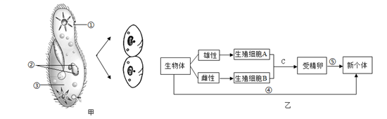 (1)图甲表示草履虫的______生殖,此过程最先发生变化的结构是______(填序号)。