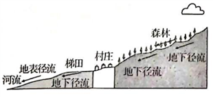 云南红河哈尼梯田有1300多年历史。当地河水蒸发到高山区凝结为云雾,雾转换成雨降落到森林,雨水再顺势流入山坡上的沟渠,灌溉层层梯田。山水四季长流,梯田常年饱水,形成了“森林、水系、村寨、梯田”为一体的完整生态系统(图5)。哈尼梯田文化景观已列入世界文化遗产名录。图6为“哈尼梯田景观图”,据此完成14~16题。