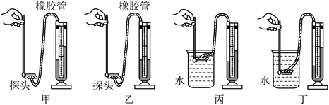 (4)若图丁中,探头在水中的深度为8cm,请你计算该处水的压强为___________Pa;![]()