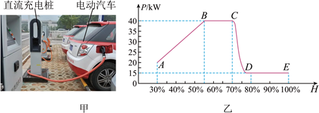 32. 电动汽车,绿色环保,在方便出行的同时也存在安全隐患,多起火灾是由于不规范充电引起的,为了安全,我们一定要规范充电。如图甲为某品牌电动汽车直流充电桩,充电电压400V,充电时功率P与储能比H(电池当前储能占充满状态储能的百分比)的关系如图像乙,在AB、BC、CD、DE四段充电过程中,哪段过程最容易使导线升温、老化,甚至引起火灾?说出你的理由。