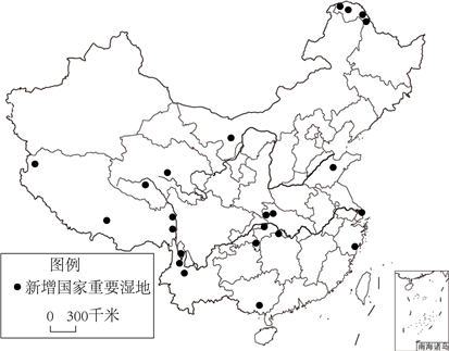 湿地是靠近江河湖海而地表有浅层积水的地带,包括河流、湖泊、沼泽等。湿地有“饮水机”“空调器”“地球之肾”之称。2023年我国新增国家重要湿地29处,目前湿地总面积居亚洲第一。图为2023年我国新增国家重要湿地分布图。完成下面小题。(环境保护主题)