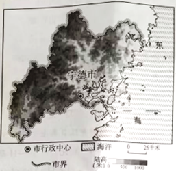 习近平总书记在福建省宁德市工作期间,率先提出、探索并实践大食物观:稳住粮食,山海田一起抓,农、林、牧、副、渔全面发展。30多年来,宁德市已形成水产、蔬菜、食用菌、林竹花卉等8种特色农产品产业链。下图为宁德市略图。据此完成下面小题。