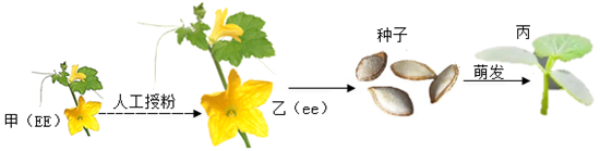 15. 南瓜果实由子房发育形成,果皮的白色和黄色是一对相对性状,由一对基因(E、e)控制,果皮白色(E)对黄色(e)为显性。下图表示把甲植株(EE)的花粉人工授粉到乙植株(ee)的雌蕊柱头上,用乙植株果实的种子培育出子一代丙植株的过程。下列叙述错误的是( )