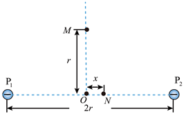 12. 真空中有两个点电荷,电荷量均为?q(q ≥ 0),固定于相距为2r的P1、P2两点,O是P1P2连线的中点,M点在P1P2连线的中垂线上,距离O点为r,N点在P1P2连线上,距离O点为x(x << r),已知静电力常量为k,则下列说法正确的是( )