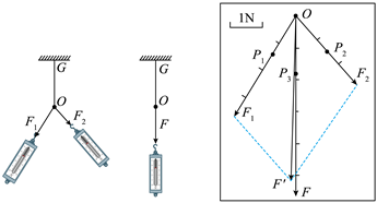 (1)在图(e)中按照给定的标度画出F1、F2和F的图示,然后按平行四边形定则画出F1、F2的合力F′。______