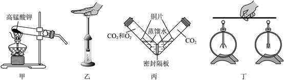 C.丙:左侧铜片生锈,右侧铜片不生锈,说明铜生锈的条件之一是与