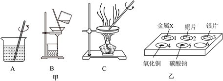 (2)①由图乙可知,孔穴1~5中分别放有金属X、铜片、银片、氧化铜、碳酸钠,分别滴加等量的稀硫酸,其中铜片和银片不与稀硫酸反应,氧化铜与稀硫酸反应,生成硫酸铜和水,没有气体生成,碳酸钠与稀硫酸反应生成氯化钠、水和二氧化碳气体,因此,孔穴1和孔穴5中有气泡产生,故填写:5。