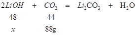 21. “神舟”飞船内,用盛有LiOH的过滤网吸收航天员呼出的CO2气体,化学方程式为:CO2 + 2LiOH = Li2CO3 + H2O。计算吸收88gCO2,需要LiOH的质量为________。