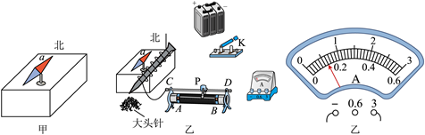 (1)如图甲,将指南针水平放置在木板上,指南针静止时a端指向北方,则a端是指南针的__________(选填“N极”“S极”),这是因为地球周围存在__________;
