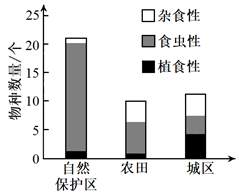 【详解】A、由图可知,自然保护区的物种数量最大,其次是城区和农田,故说明自然保护区的植被群落类型多样,鸟类物种丰富度高,A正确;