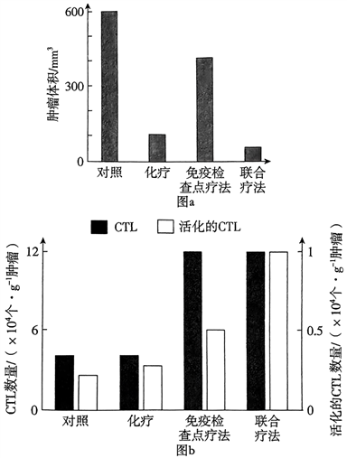 【详解】(1)由图a可知,联合疗法肿瘤体积最小,再根据图b可知,采用联合疗法时活化的CTL的数目明显高于免疫检查点疗法和化疗等,原因是该疗法既发挥了化疗药物的作用,也增加了活化的CTL数量。