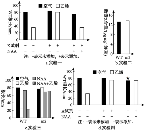 【详解】(1)由实验一结果分析,加入K试剂不加NAA组与加入K试剂和NAA组对比可发现,同时加入K试剂和NAA,乙烯可以抑制WT根伸长,由题干信息K试剂抑制激素X的合成,可推测NAA的作用效果和激素X类似,NAA是生长素类似物,所以推测激素X为生长素。