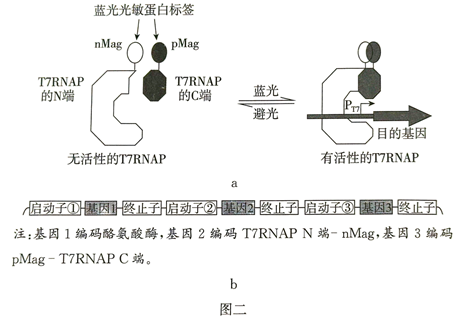 (2)题图二a分析可知,蓝光照射下,T7RNAP N端-nMag与T7RNAP C端结合,导致无活性的T7RNAP变成有活性的T7RNAP,结合图一,蓝光处理后,RNA聚合酶(T7RNAP)识别启动子①使基因1转录获得相应的mRNA,再以其为模板通过翻译过程获得酪氨酸酶,酪氨酸酶从而催化染色液中酪氨酸形成黑色素,可见基因2和3正常表达无活性产物,被蓝光激活后再启动基因1表达,综合上述分析可知,为实现蓝光控制染色,启动子①②及③依次为PT7、PBAD 和PBAD。