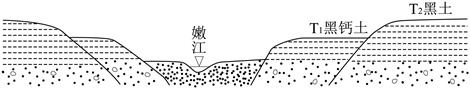 黑土和黑钙土是嫩江流域的典型土壤,多分布在广阔平坦的阶地面上(如下图)。分布在二级阶地(T2)上的黑土,形成时期气候暖湿;分布在一级阶地(T1)上的黑钙土,形成时期气候暖干,淋溶作用强度发生了变化,土壤剖面出现钙积层,钙积层过浅不利于作物稳产高产。近百年来,因过度开垦,土壤有机质含量减少,水土流失严重,制约农业可持续发展,影响国家粮食安全。