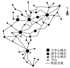 【详解】(1)读图可知,图中有a、b、c、d、e5个主中心城市,体现出多核心(多中心)的特征,同时根据图例看看出节点非常多,体现出多节点;从图例中可看出有主中心城市、副中心城市、次中心城市及节点,体现出多层次(等级化、多层级)的特征;各城市间通过轨道交通联系,体现出网络化(互联互通)的特点。
