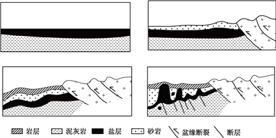 滨里海盆地南邻里海,东邻乌拉尔山,油气资源丰富。盆地东部发育一套巨厚盐层,在乌拉尔造山运动产生的区域挤压力和上覆地层差异压力等共同作用下,盐发生塑性流动,导致盐底辟构造形成(图)。盐层不仅为其下伏泥灰岩(可生油气且可储油气)中的油气藏提供了优质封盖层,也为其上覆砂岩(不生油气但可储油气)中的油气藏提供了封堵条件。