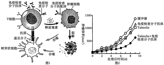 (2)设置缓冲液组的作用是作为对照组,用于排除其他无关因素对实验结果的干扰,从而更准确地评估Tal与免疫检查分子抗体的联合抗肿瘤效应。据图2可知,与缓冲液组相比,免疫检查分子抗体组、Tal组和Tal +免疫检查分子抗体组的肿瘤体积都有所减小,其中Tal +免疫检查分子抗体组的肿瘤体积减小最为明显。故得出结论:Tal 与免疫检查分子抗体都有抗肿瘤效果,二者联合使用可明显增强抗肿瘤效果。