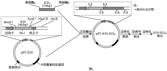 (2)将目的基因导入细菌时常用CaCl2处理细菌,是其处于感受态。由图可知,重组DNA含有标记基因卡那霉素抗性基因,所以转化后的大肠杆菌采用含有卡那霉素的培养基进行筛选。成功导入pET-SOD-ELP50同时含有pET-SOD和ELP50,结合图示可知,选引物S-F和E-R可特异性对pET-SOD-ELP50进行扩增。