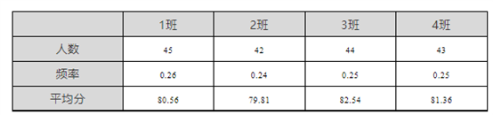 26、某校高二语文期末数据如下表,求四个班的额总平均分,下列选项正确的是( )。