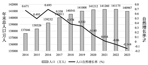 截至2023年末,全国60岁及以上人口占全国人口的21.1%(统计数据不包括港澳台),人口老龄化严重。读2014-2023年中国人口数量和人口自然增长率变化情况图(下图),完成下面小题。