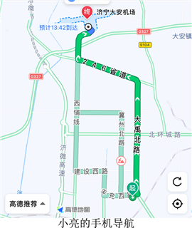 2024年春节期间,家住兖州区李家湾小区的小亮一家从大安机场乘飞机外出旅游,用手机导航确定去机场的路线,屏幕显示如下图。完成下面小题。