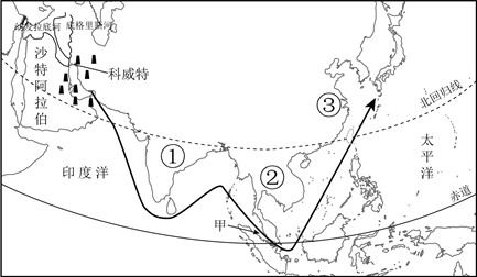 A. 地处亚、美、非三大洲交界处,地理位置重要 B. 输出到东亚的石油经过甲地霍尔木兹海峡