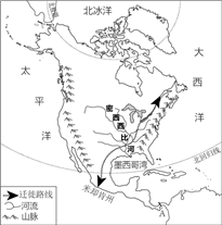 (3)北美洲地势东西高,中部低,山脉南北纵列分布,来自北冰洋的严寒气流能长驱南下,影响该地区。