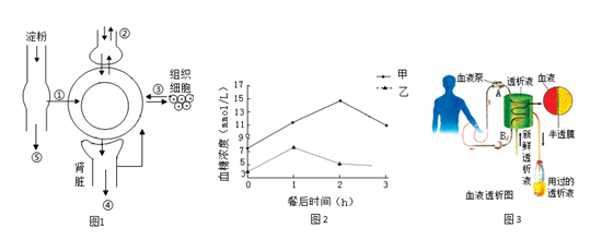 28. 糖类是人体最主要供能物质。人体细胞分解葡萄糖释放能量,供生命活动需要,并将产生的废物排出体外,这就是糖类代谢的基本过程。当人体因肾功能衰竭不能将代谢废物排出时。人就会因中毒而死亡,目前,患者可以使用人工肾脏进行血液透析,以便及时排出体内的废物。图1示人体糖类代谢的基本过程,①-⑤表示人体的生理活动;图2示甲、乙二人饭后一段时间检测到体内血糖浓度的变化;图3是血液透析示意图。请据图分析回答下列问题: