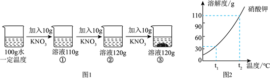 (1)图1三次实验中所得溶液饱和的是______(填序号),该温度下硝酸钾的溶解度为_____g。