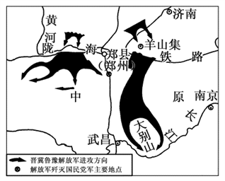 13. 周恩来总理曾对一次军事行动做了一个形象的比喻:黄河是蒋介石的“外壕”,陇海路是他的“铁丝网”,长江是他的“内壕”,而我们已经过了“铁丝网”,打到他的“内壕”了。结合右图,指出这一军事行动是( )