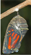 14. 五一假期,小张同学一家去了青檀寺的蝴蝶谷游玩。他发现一只褐色带斑纹的“虫子”垂挂在一种植物叶片背面的叶柄处,一动不动,用手摸一下感觉光滑且硬硬的,如图所示。学生物学的爸爸告诉他,这“虫子"是蝴蝶发育过程中的( )