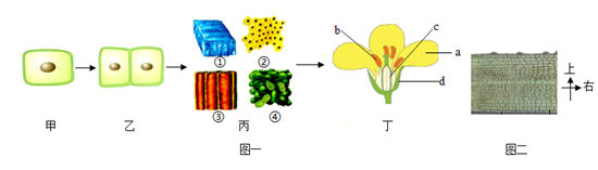 21. “黄萼裳裳绿叶稠,千村欣卜榨新油。”油菜的种子可以榨油,花具有很高的观赏价值,因而被人们广泛种植。图一为油菜植株个体发育不同时期的结构层次,其中序号①~④表示丙的不同类型,字母a~d表示丁的部分结构,图二为显微镜下的油菜根尖部分结构。