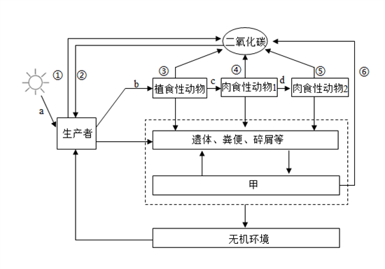 25. 生态系统的结构模型如图所示,其中序号①~⑥表示生理过程,字母a~d 表示流入各营养级的能量值。请据图回答下列问题