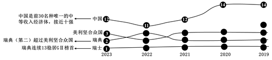 【答案】22. 2019到2023年,在全球创新指数排名中,中国作为前30名中唯一的中等收入经济体,排名分别为14名、14名、12名、11名、12名,整体呈上升趋势,其中2022年排名最靠前,接近10强。