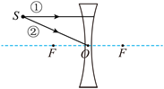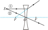 15. 如图所示,光源S发出的两条光线射向凹透镜,其中光线①平行于主光轴,光线②经过光心,画出它们经过凹透镜的折射光线。(须保留必要的作图痕迹)