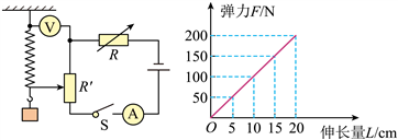 。金属弹簧上端固定并通过导线与电压表连接,下端通过金属指针与导体棒始终保持良好接触。已知,电路中所用弹簧的弹力F与其伸长量L之间的关系如图乙所示。实验中弹簧的形变始终不超弹性限度,弹簧及指针质量不计,取
