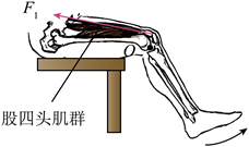 26. 如图所示,小明坐在座椅上,伸小腿时,小腿绕膝关节上固定点O转动,股四头肌群收缩提供动力