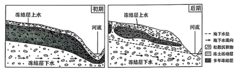 某河发源于祁连山脉,其河源区分布的厚层松散沉积物构成了地下水的主要含水层。长期监测发现,随着气候变暖,冻土退化导致地下水的存储、运移及出露发生变化。下图为监测初期和后期该河河源区河谷剖面示意图。据此完成下面小题。