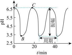 ”4种原料按固定流速不断注入连续流动反应器中,体系pH-t振荡图像及涉及反应如下。其中AB段发生反应①~④,①②为快速反应。下列说法错误的是