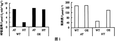 16. 为探究水通道蛋白NtPIP对作物耐涝性的影响,科研小组测定了油菜的野生型(WT)及NtPIP基因过量表达株(OE)在正常供氧(AT)和低氧(HT,模拟涝渍)条件下的根细胞呼吸速率和氧浓度,结果见图1。