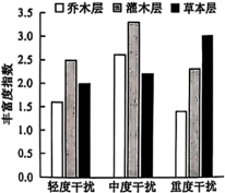 17. 人为干扰导致的栖息地碎片化对生物多样性和群落结构具有重要影响。为探究某群落的物种多样性及优势种生态位宽度与人为干扰的耦合关系,科研小组调查了不同人为干扰强度下的群落结构特征。