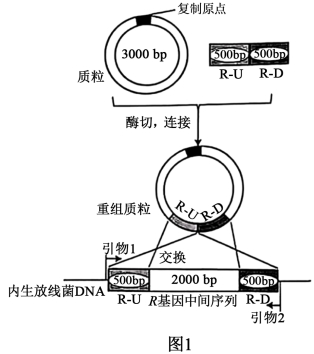 (2)经筛选获得一株内生放线菌,该菌株高效合成铁载体小分子,能辅助内生放线菌吸收铁离子。R基因是合成铁载体的关键基因之一。科研小组构建R基因敲除株,探究铁载体的功能。主要步骤如下:首先克隆R基因的上游片段R-U和下游片段R-D;然后构建重组质粒;最后利用重组质粒和内生放线菌DNA片段中同源区段可发生交换的原理,对目标基因进行敲除。如图1所示。
