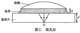13. 用光学显微镜观察样品时,显微镜部分结构示意图如图甲所示。盖玻片底部中心位置O点的样品等效为点光源,为避免O点发出的光在盖玻片上方界面发生全反射,可将盖玻片与物镜的间隙用一滴油填充,如图乙所示。已知盖玻片材料和油的折射率均为1.5,盖玻片厚度
