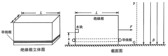 15. 如图所示,光滑水平面上有一个长为L、宽为d的长方体空绝缘箱,其四周紧固一电阻为R的水平矩形导线框,箱子与导线框的总质量为M。与箱子右侧壁平行的磁场边界平面如截面图中虚线PQ所示,边界右侧存在范围足够大的匀强磁场,其磁感应强度大小为B、方向竖直向下。