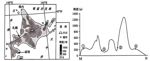 当地时间2025年5月23日6时28分,日本的北海道地区发生了5.6级地震,札幌市有明显震感。札幌是北海道地区的中心城市,充满冰雪魅力,承办过三届亚冬会和一届冬奥会。图1为北海道地区地形图,图2为沿MN线的地形剖面图,据此完成8~11题。