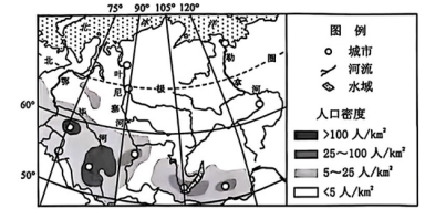 27.西伯利亚位于俄罗斯的亚洲部分,这片广袤而神秘的土地,是人类文明的古老摇篮之一。这里流淌着三条并驾齐驱、浩浩荡荡由南向北注入北冰洋的河流,但航运价值较低。图为西伯利亚局部地区人口分布图,据此完成下列各题。(8分)