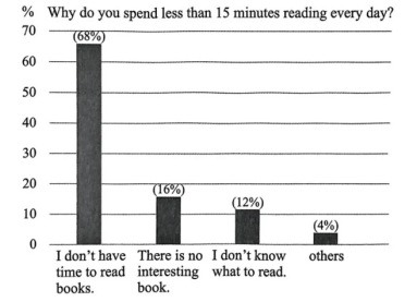According to the survey, 16% show little interest in reading.12% don't know what to read. And 4% have other reasons. Most students, about 68%, think they have no time. However, I think if we truly want to read, we can always find time.